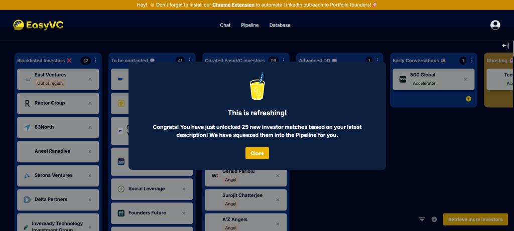 LinkedIn Outreach Automations: With EasyVC’s Chrome extension, users can automate LinkedIn outreach to portfolio founders of target investors. This functionality is designed to streamline the process of securing warm introductions, which can increase the chances of a response.